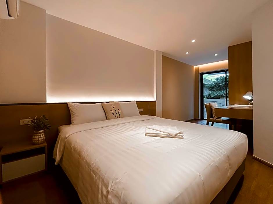 A traveler-friendly vibe meets practical comforts, with garden scenery, a balcony to enjoy the outdoors, and a kitchenette ready for quick meals during a Bangkok stay.